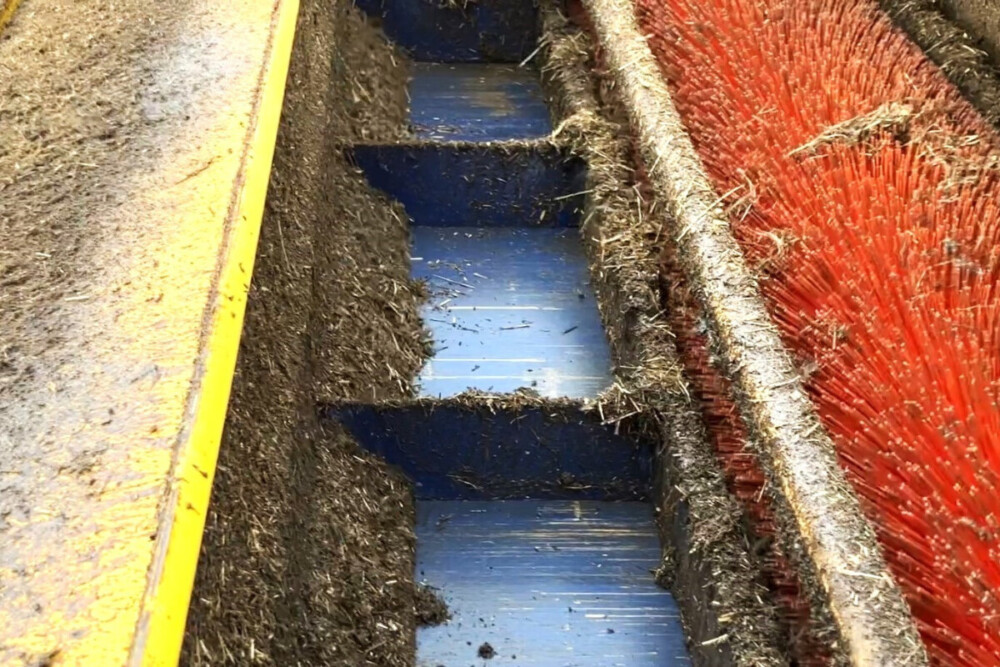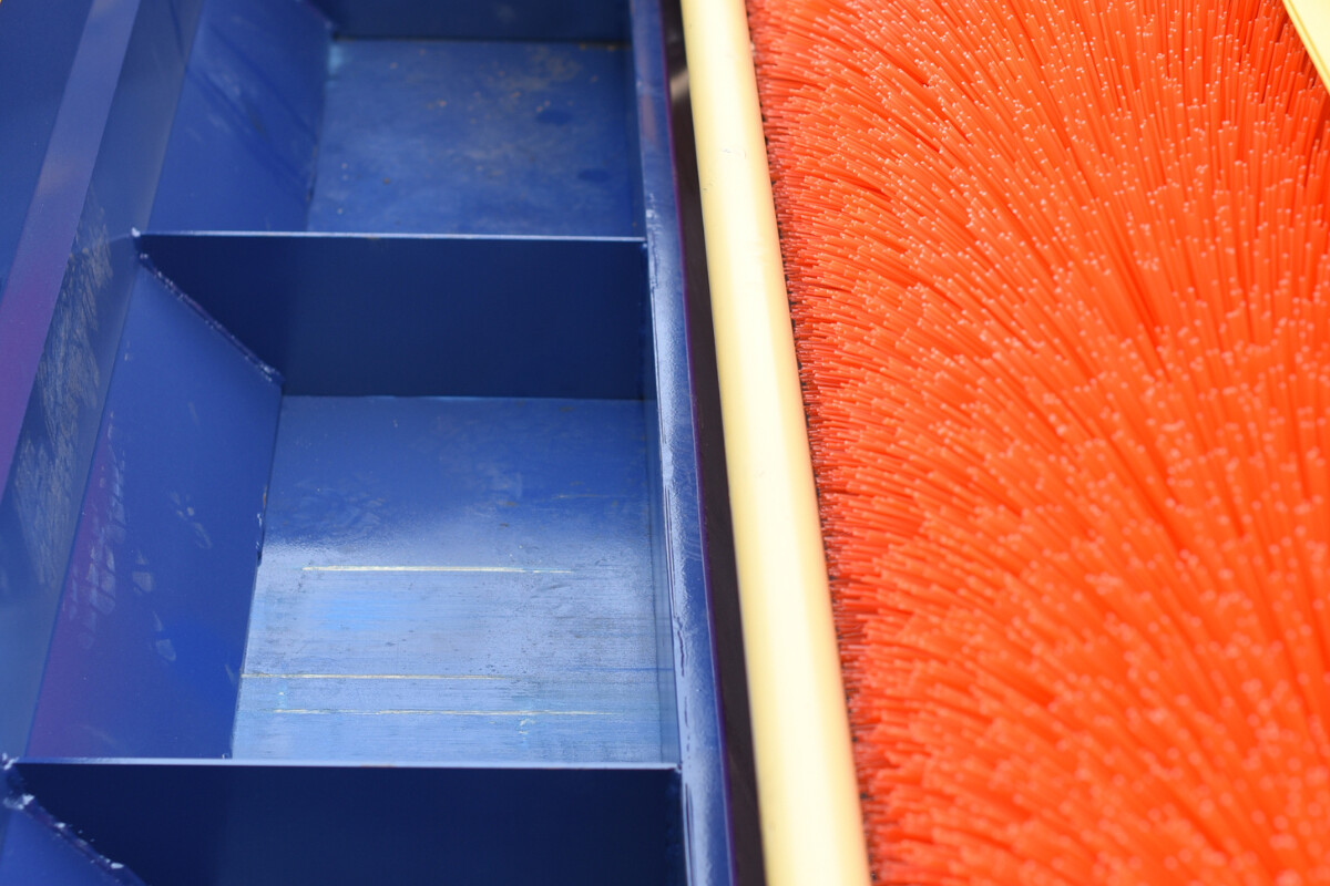 Le bac récolteur est compartimenté. L’avant du bac racle le sol et collecte les déchets. La brosse de finition projette la matière directement dans le bac ramasseur.