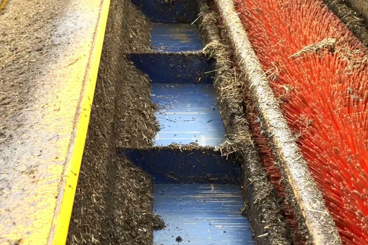 Le bac récolteur est compartimenté. L’avant du bac racle le sol et collecte les déchets. La brosse de finition projette la matière directement dans le bac ramasseur.
