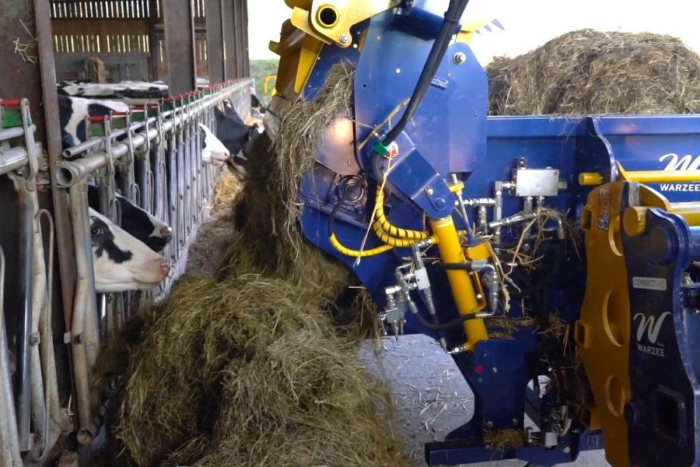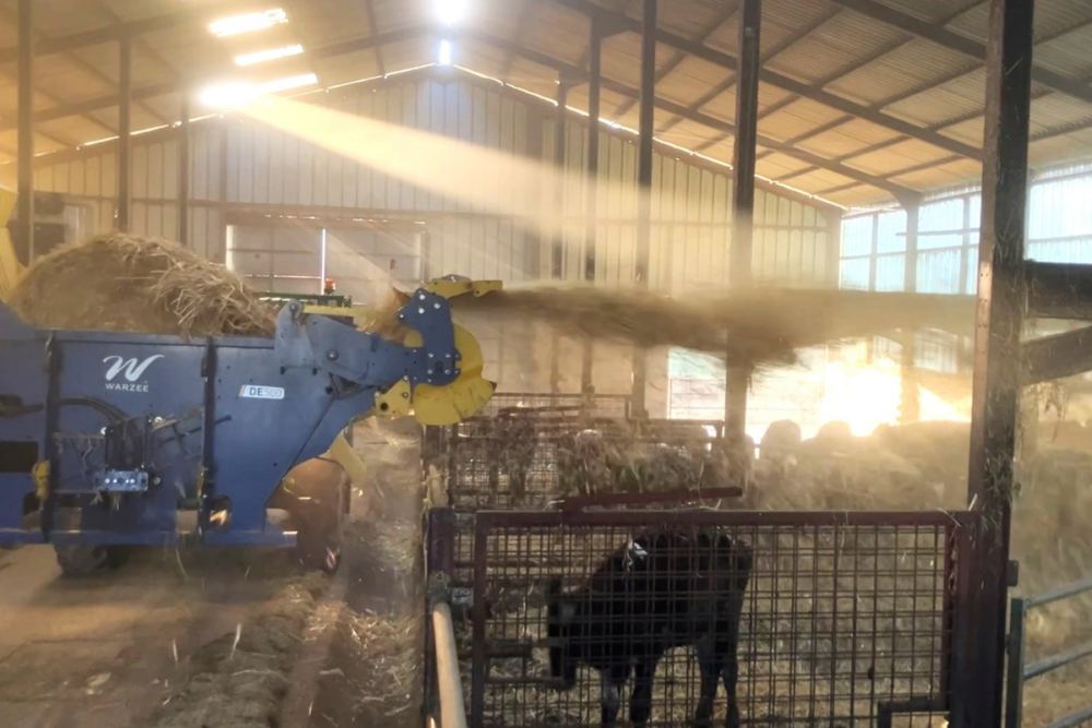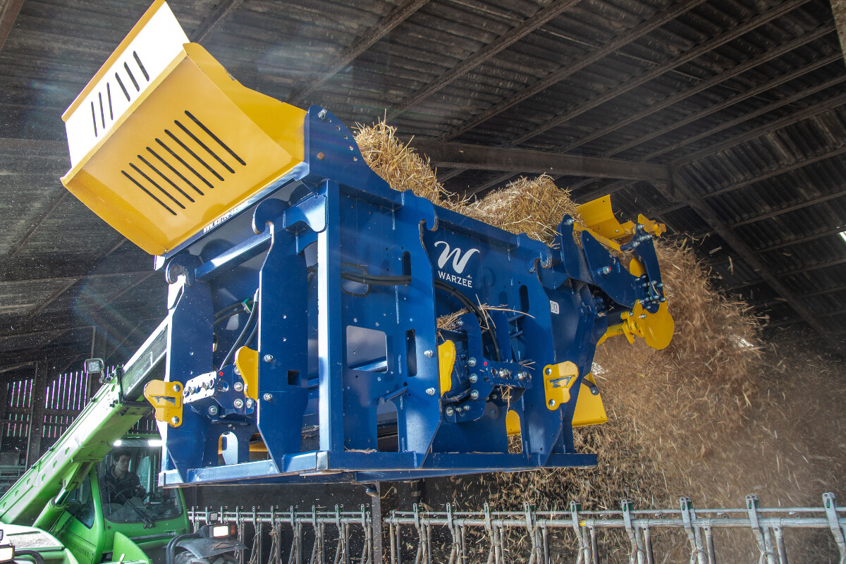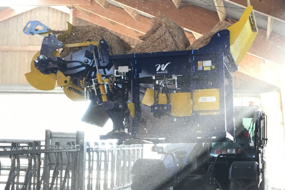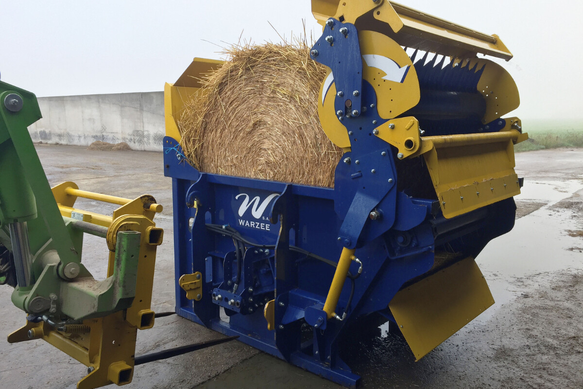 Polyvalente, la dérouleuse-pailleuse Warzée DE500 distribue des balles rondes de fourrage, de foin et d’enrubanné. Cet équipement permet aussi de pailler des bottes rondes et carrées jusqu’à 15 mètres.