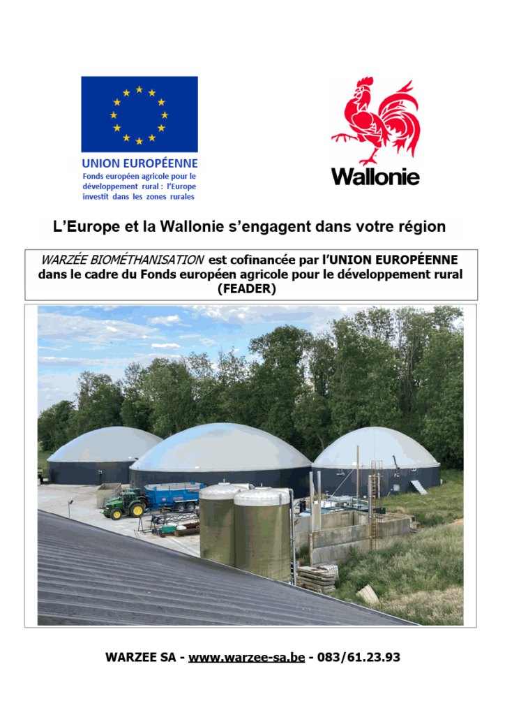 WARZÉE BIOMÉTHANISATION est cofinancée par l’UNION EUROPÉENNE dans le cadre du Fonds européen agricole pour le développement rural (FEADER)